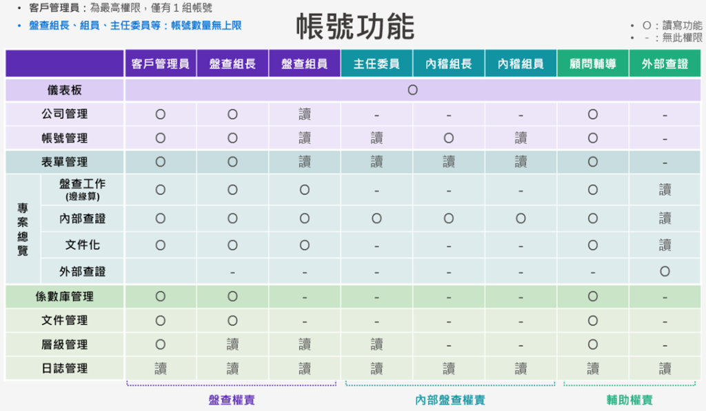 1.您可以根據貴公司實際組織的情況來設定對應的帳號權限。以下是一個參考權限表,您可以根據需要設定相應的權限。